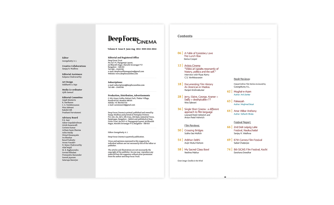 Deep Focus – Film Quarterly was born from the passion of Bangalore Film Society members, guided by an advisory panel of eminent Indian filmmakers such as Adoor Gopalakrishnan, Girish Kasaravalli, Govind Nihalani and the late film archivist P.K. Nair.